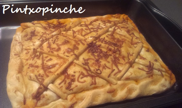 - Ponemos sobre una placa de horno con papel sulfurizado la masa estirada de mayor tamaño, sobre esta el relleno, cubrimos con la masa más pequeña, sellamos con los dedos los bordes, decoramos con restos de masa y untamos con huevo.