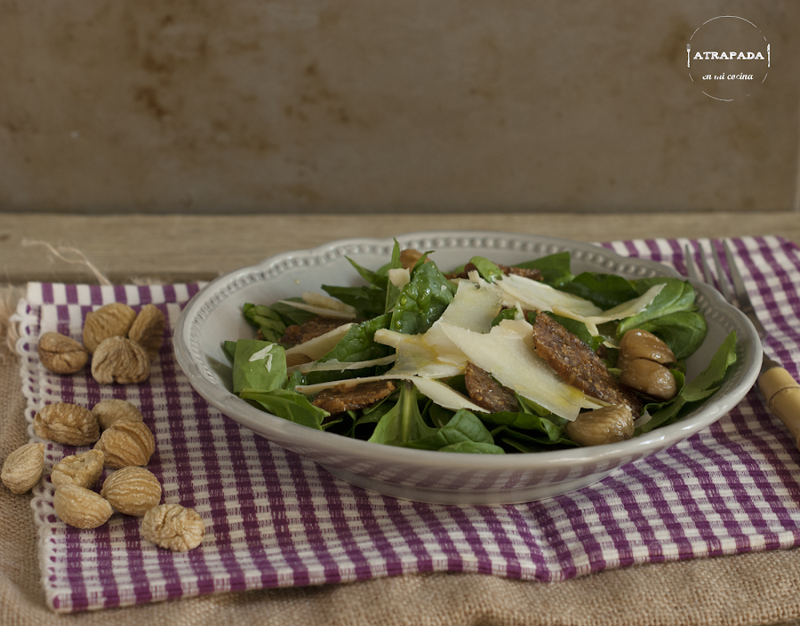 Como una cena sin ensalada no sería una cena, ésta es una buena propuesta para continuar, una ensalada de espinacas con tres quesos, pan de higos y castañas caramelizadas.