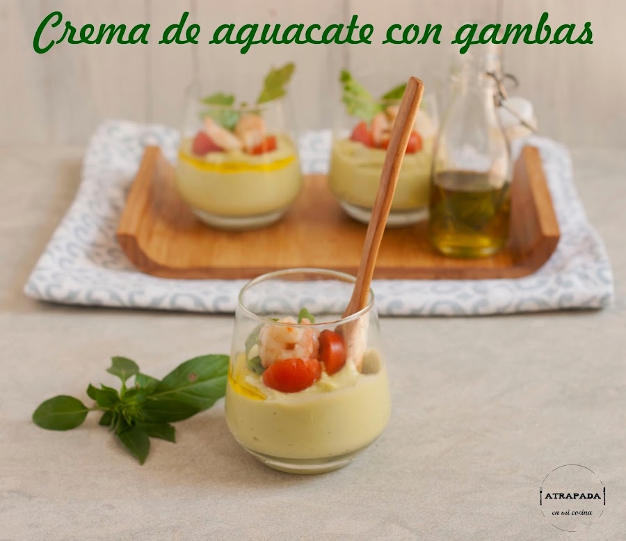 Continuamos con una crema de aguacate con gambas y cherrys. Podéis servirlo antes de la ensalada en versión mini, o como entrante a la comida principal.
