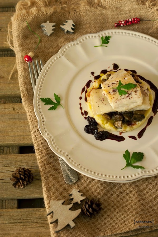 Si queréis conquistar al personal con un plato de pescado éste tiene muchas papeletas para ello. Es un plato muy completo, y gustará incluso a los poco amantes del pescado, lubina con reducción de vino tinto y parmentier de patatas y setas.