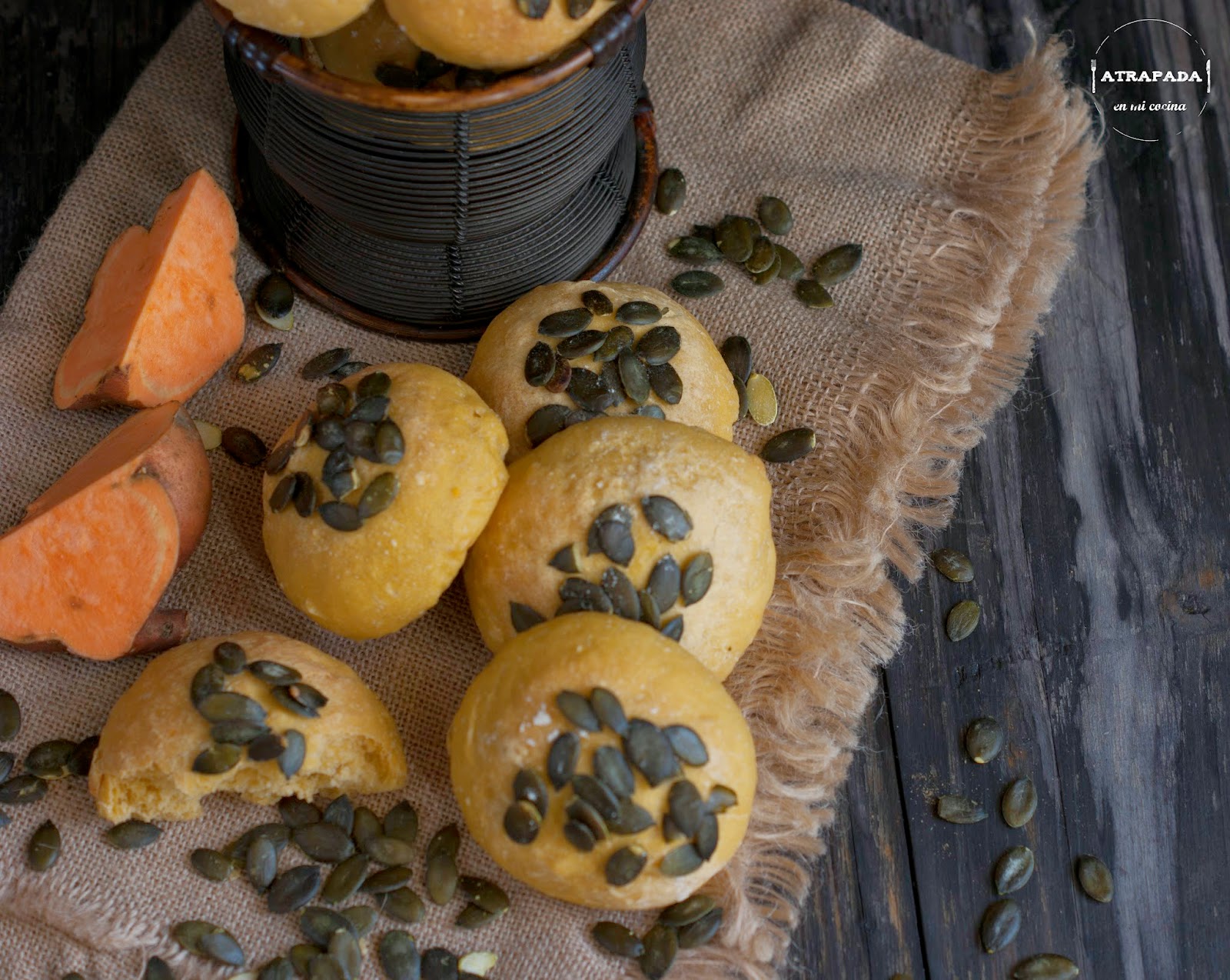 Y este foie mi-cuit se merece unos estupendos panecillos para acompañarlo, y no se me ocurren éstos que publiqué no hace mucho, unos riquísimos panecillos de boniato con pipas de calabaza.