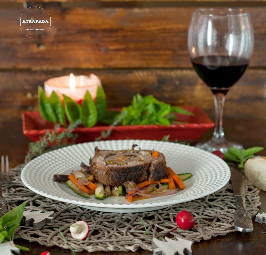 Para terminar, y antes de pasar a los postres, una ración de esta aleta de ternera rellena de paté y pistachos, acompañado de unas verduritas. Después de ésto tendremos que hace un descanso hasta llegar al postre. Que en estas comidas tan copiosas es bueno ir dosificando.