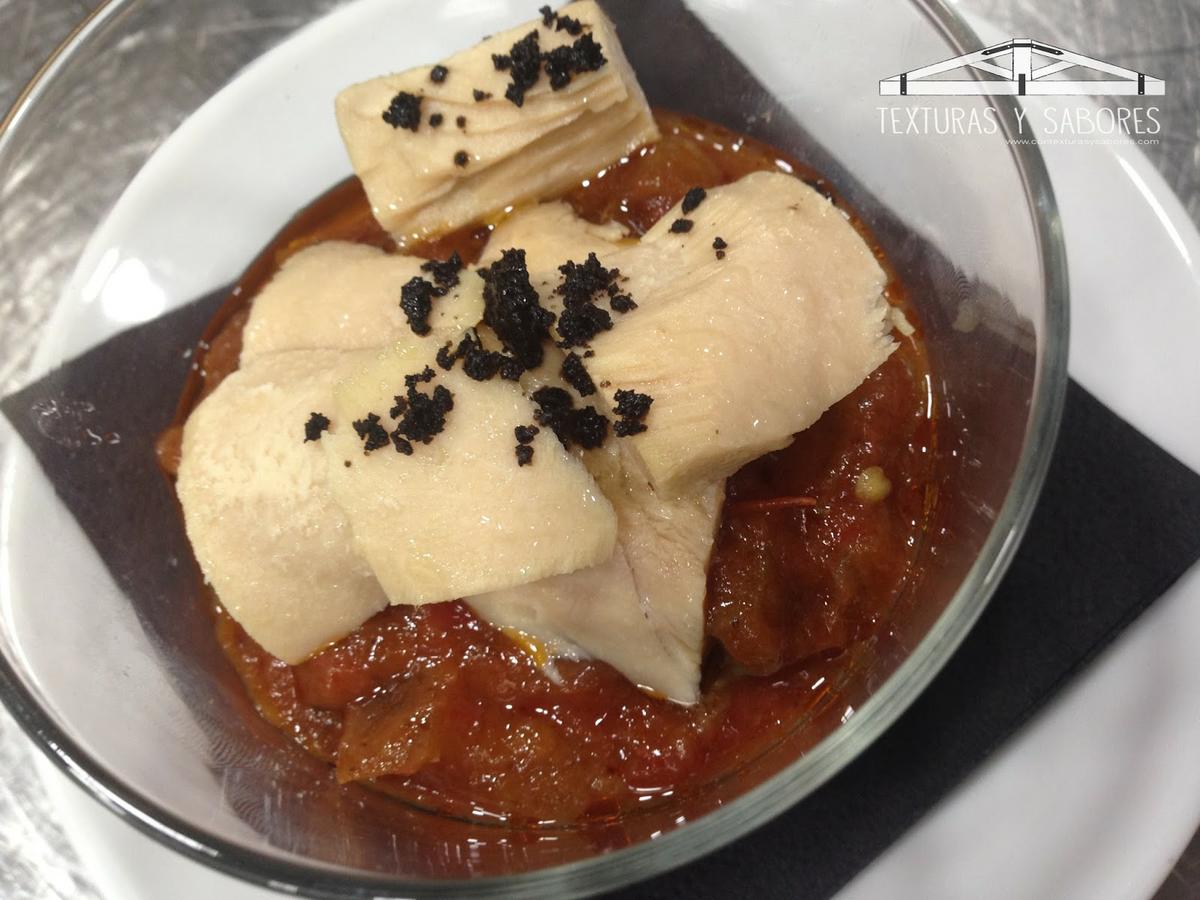 La primera propuesta es este entrante de mini vaso de pisto murciano con lascas de ventresca con polvo de aceituna negra.