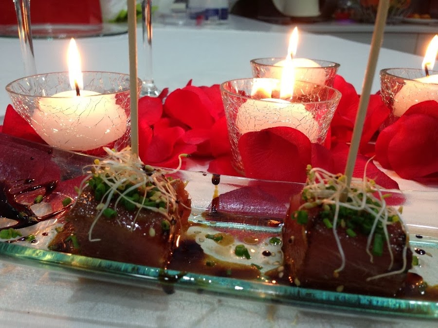 Atún fresco (mejor de la parte del solomillo) tres tacos por persona de unos 3 cm.