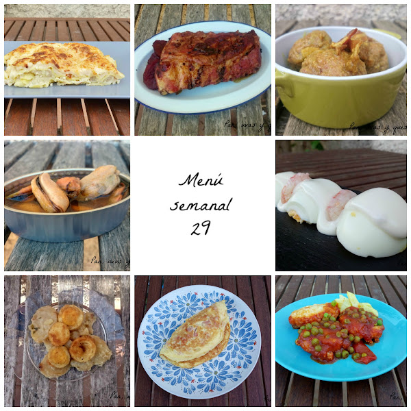 Costillas de cerdo con salsa agridulce Huevos escalfados con picadillo Mejillones en escabeche Tortilla de queso y bacon