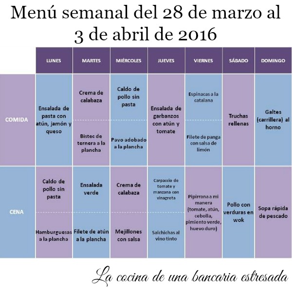 Y ya tenemos lista toda la semana, espero que os vayan gustando los menús, si tenéis sugerencias o algún capricho me lo contáis y a ver como lo encajamos, jejeje.
