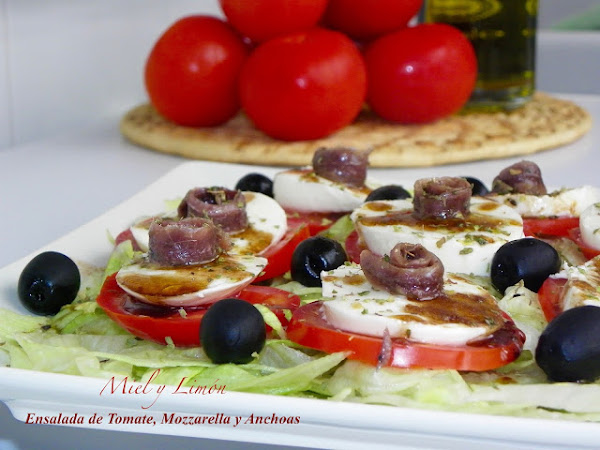 Para cenar...ENSALADA DE TOMATE MOZZARELA Y ANCHOA
