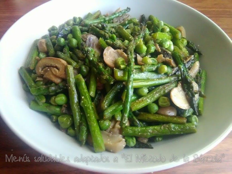 Salteado de trigueros con guisantes y champiñones