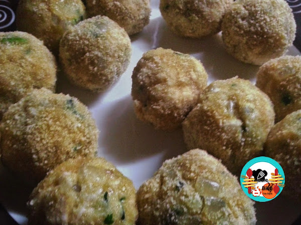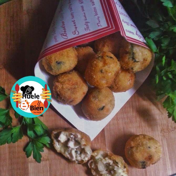 3.- A continuación hacemos bolitas con las manos limpiamos, las pasamos por huevo batido y pan rallado mezclado con un poco de harina. Las freímos en abundante aceite caliente. Las escurrimos sobre papel de cocina. Las podemos acompañar con unas patatas fritas.