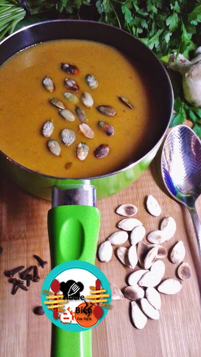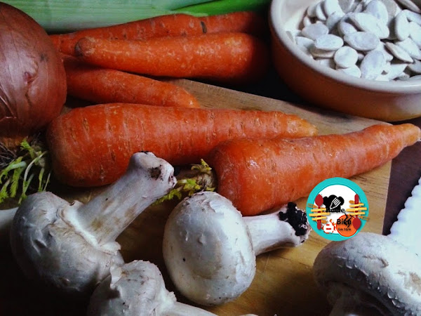 (Reservamos un poco de caldo y lo colamos). Retiramos las especias y el laurel, trituramos con el brazo las verduras. Rectifícamos de sal si es necesario. En una sartén tostamos las pipas de calabaza, las pelamos y las servimos con la crema de verduras.
