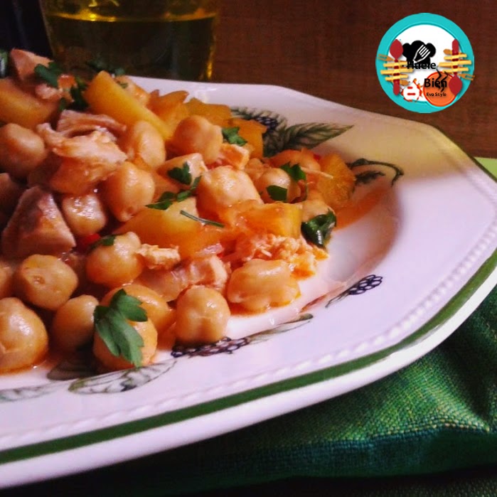 A continuación, ponemos el bote de garbanzos. Lo abrimos, lo pasamos por agua y escurrimos bien. Cocinamos otros 5 minutos. Añadimos las patatas fritas y dejamos que se cocine nuevamente 5 minutos. Apagamos el fuego. Picamos el perejil fresco y lo mezclamos todo con una cuchara de madera. Retiramos del fuego.