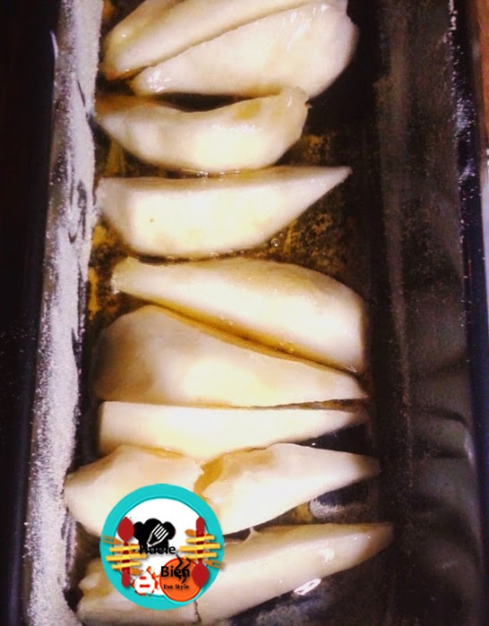 1.- Pelamos las peras, descorazonamos y cortamos en gajos. Rociamos con el jugo de lima. Engrasamos un molde con margarina y espolvoreamos con pan rallado. Ponemos las peras dentro del molde cubiertas con la miel.