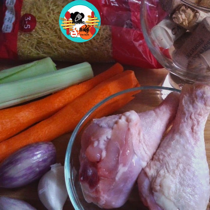 2.- Le quitamos la piel al pollo, lo introducimos en la olla. Lo rehogamos unos minutos. Llenamos la olla de agua hasta cubrir la carne y las verduras. Llevamos a ebullición y bajamos la temperatura del fuego. Cocinamos a fuego medio 30 minutos. Después añadimos los fideos y el bote de alubias, lavadas y escurridas. Cocinamos 20 minutos más. apagamos el fuego y dejamos reposar unos minutos. Servimos caliente con una ramita de hierbabuena.