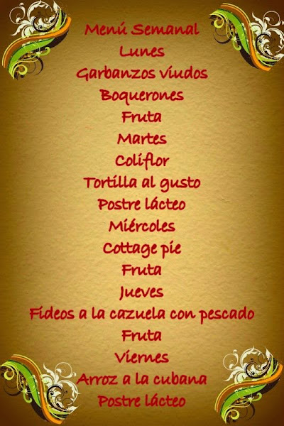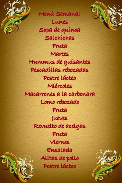 Ah! y de paso, os dejo los enlaces a las recetas que probaremos estos días, sólo tenéis que clicar en los nombres que os dejo debajo del menú.