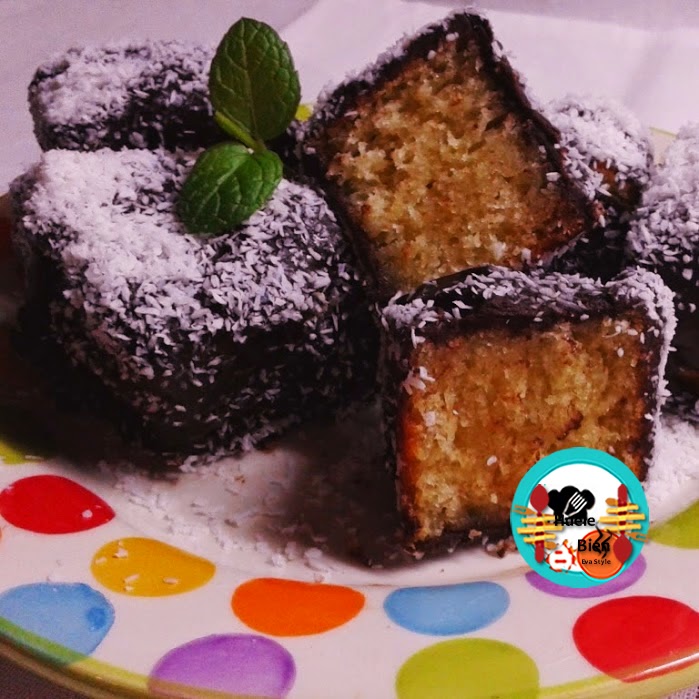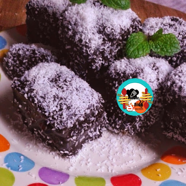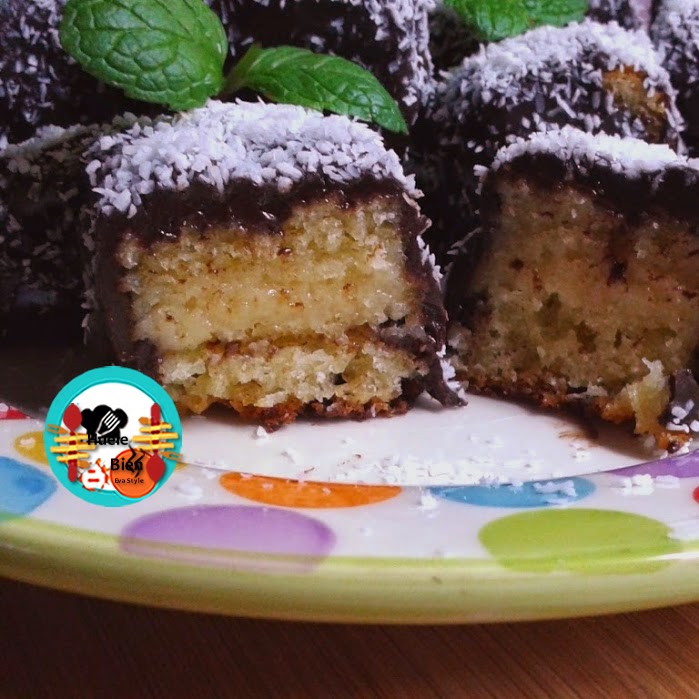 8.- Cortamos el bizcocho en tacos medianos. Los ponemos sobre una rejilla y cubrimos con el chocolate. Cubrimos con el coco rallado y dejamos reposar para que el chocolate se seque.