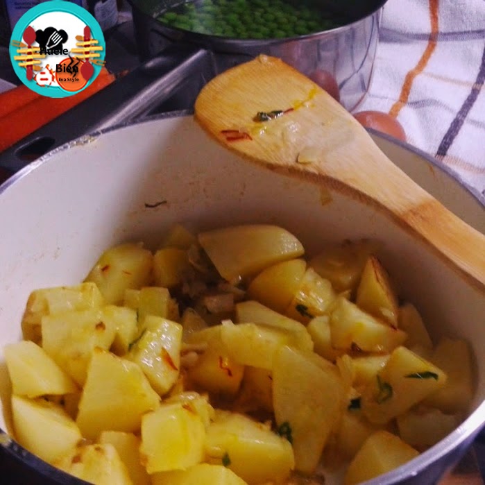 1.- Pelamos las patatas, las lavamos bien y las cortamos en dados regulares. En una cacerola rehogamos la cebolla picada y las patatas. Salpimentamos, espolvoreamos un poco de pimentón, el azafrán y cocemos unos minutos más.