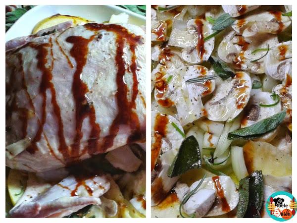2.- Salpimentamos, ponemos hierbas aromáticas esparcidas sobre la fruta y las verduras. Rociamos con aceite de oliva, el caramelo y la salsa inglesa.