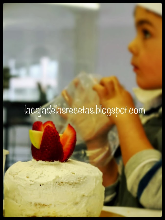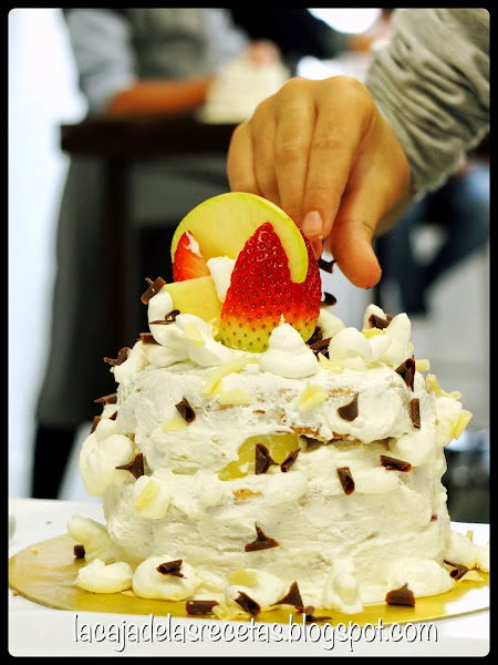 Cortamos el bizcocho en 3 partes de forma longitudinal cuando esté frío. Mojar las partes con el almíbar. Montamos la tarta colocando el bizcocho, una capa de crema, otra de bizcocho, una de nata (crema de leche), fruta natural cortada en láminas, y la tapa de bizcocho. Recubrimos toda la tarta con la nata montada (crema de leche) ayudados de una espátula pastelera, y decoramos al gusto con la manga, las virutas de chocolate y la fruta.