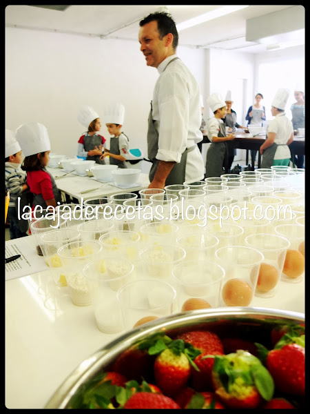 Para hacer el bizcocho, separamos la clara de la yema y batimos cada uno de ellas por separado con la mitad del azúcar. Con la clara haremos un merengue, y con la yema, batiremos hasta blanquear. Incorporamos la yema al merengue, mezclando con una lengua con un movimiento envolvente, y añadimos la harina.