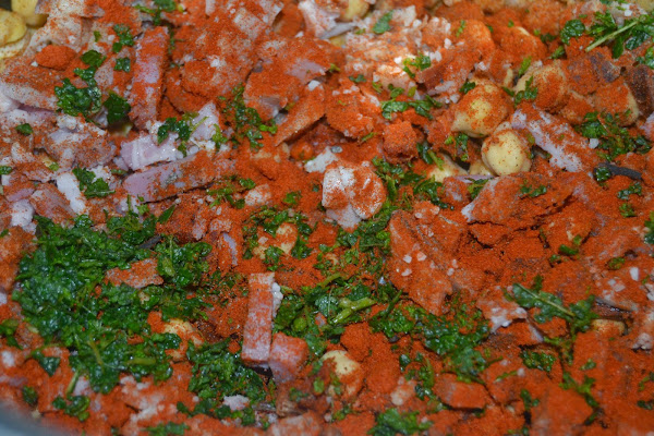 Añadimos también, el laurel, clavos, la hierbabuena picadita, pimienta molida y pimentón, yo le añado también un poco de pimentón picante.