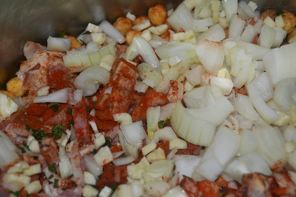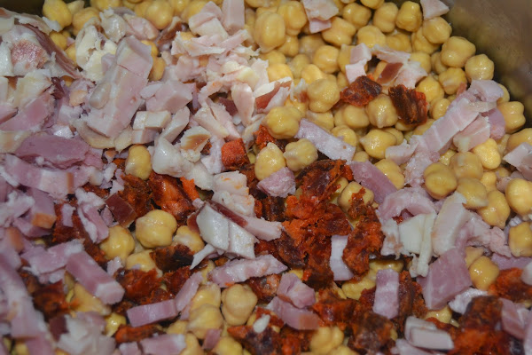 En la olla expres ponemos los garbanzos escurridos, el chorizo a trozos, el bacon y el tocino ibérico picado.