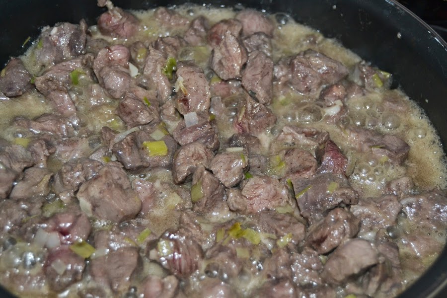 Encima de esto echamos la carne reservada con el brandy que habíamos dejado en la cazuela, y un poco de sal.