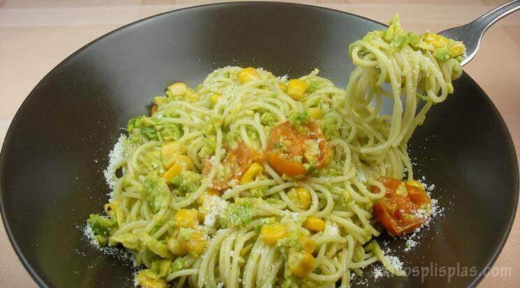 Pasta al pesto de aguacate y Ensalada Salud