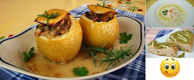 Manzanas rellenas de carne y Crema de patata con huevo poché