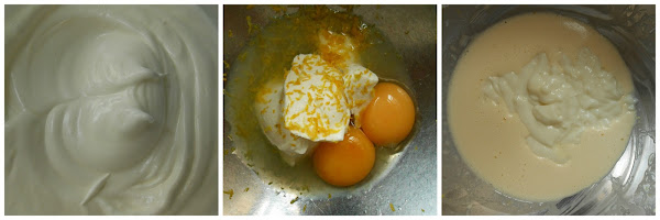 En otro bol colocamos el queso, las yemas de huevo,el zumo y la ralladura de limón, batimos bien hasta que espume. Incorporamos la crema de fécula batiendo bien.