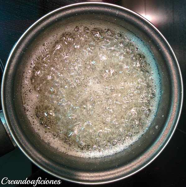 En el almíbar que tenemos en el cazo empezaran a formarse una burbujas, si tenemos un termómetro de cocina sabremos que esta en su punto, cuando alcance los 120º C. Si no tenemos, cogemos un poco de almíbar con una cuchara de madera y lo ponemos entre el dedo gordo e índice, se queda un hilo entre los dos dedos al abrir y cerrarlos, ya estará.