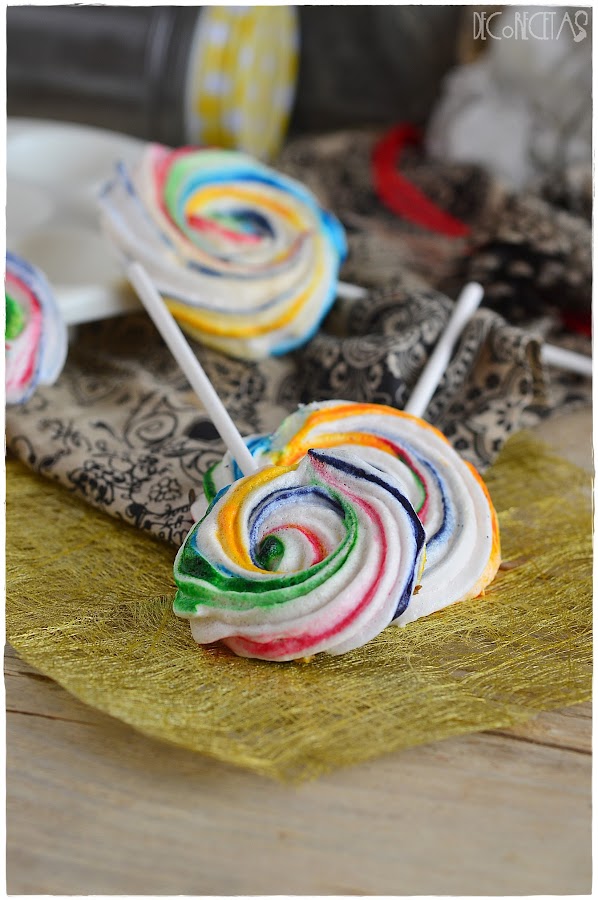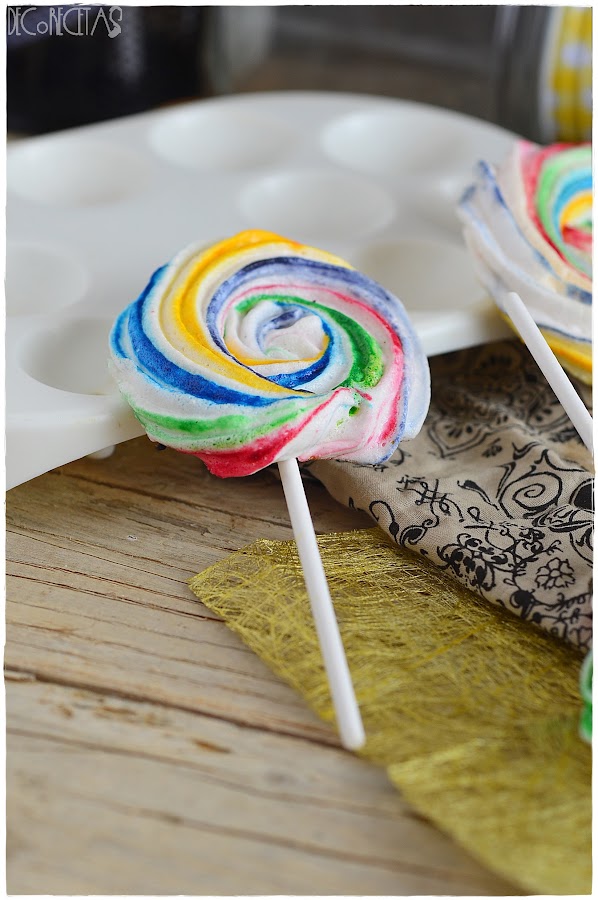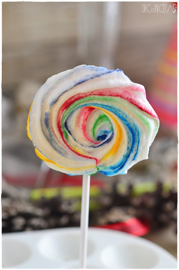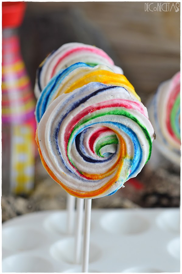 Lo que hice para ver como podía aprovecharlo, fue verme el vídeo de "Lolita la pastelera" donde explicaba como hacer estas bonitas "piruletas". Manos a la obra, tan sólo tenía que tintar la manga como ella nos explica y hacer los merengue pops en forma de rosa para meter al horno a 100º por 60 minutos. Por último, con ayuda de chocolate fundido, pegamos el palito y listo!