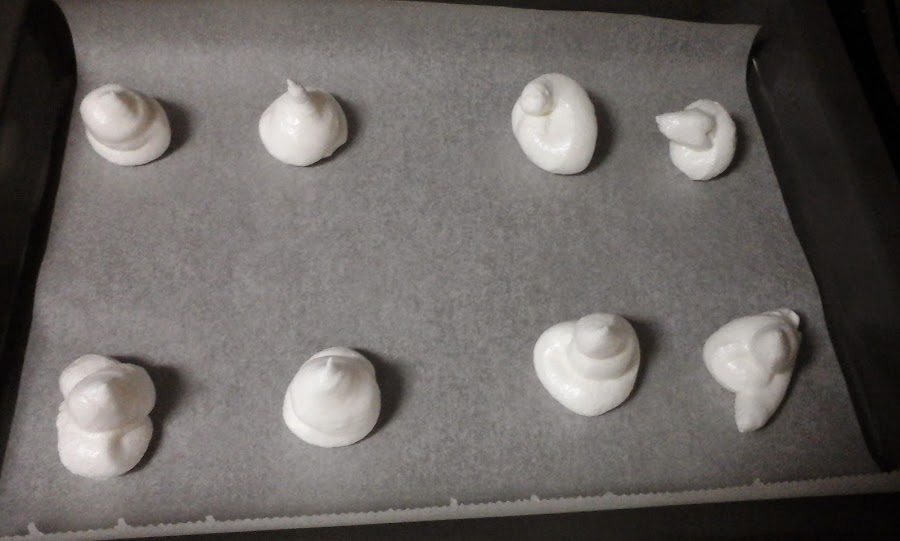 Tenéis que batir hasta que las claras de huevo adquieren una textura firme y brillante. Colocamos el merengue dentro de una manga pastelera. Forramos la bandeja de horno con papel de horno y vamos haciendo las figuras que queramos con el merengue, dejamos espacio entre ellos, ya que en el horno suben un poco. Reducimos la temperatura hasta los 100º y los tenemos 90 minutos en el horno.