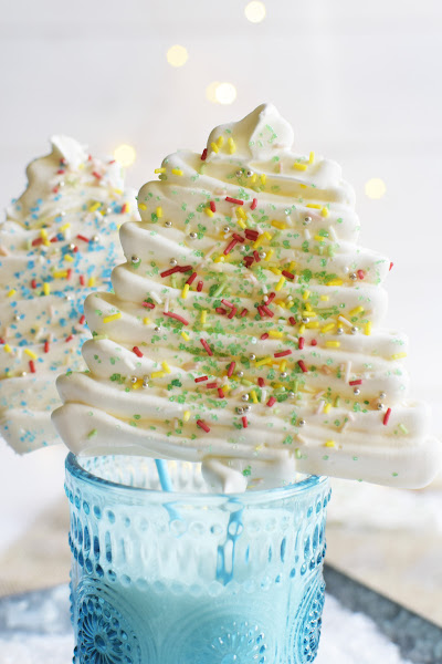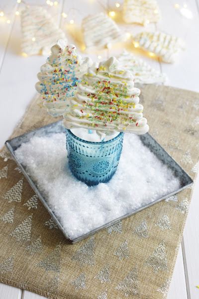 6. Pasamos el merengue a una manga pastelera con una boquilla plana, nosotras usamos la 104 de Wilton. Sobre el papel de horno vamos trazando líneas de un lado a otro con la manga, formando los arbolitos de navidad. Por encima, decoramos con nuestros sprinkles preferidos.