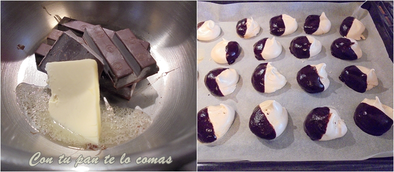 3. Derrite el chocolate con la mantequilla al baño maría, y baña la mitad de cada merenguito. Vuelve a ponerlos sobre papel vegetal y deja que se enfríen para que se solidifique el chocolate.