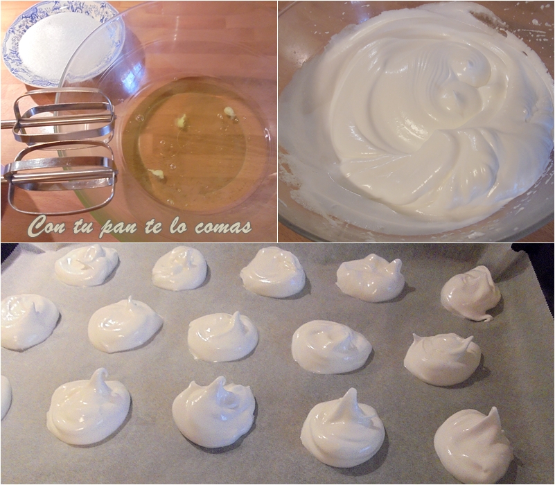 2. Enciende el horno a 125-130ºC. Pon una hoja de papel vegetal en la bandeja del horno y ve poniendo cucharadas del merengue (te saldrán dos bandejas). Cuando el horno esté caliente mete los merengues y deja que se hagan de 45 minutos a 1 hora para que queden secos por fuera.