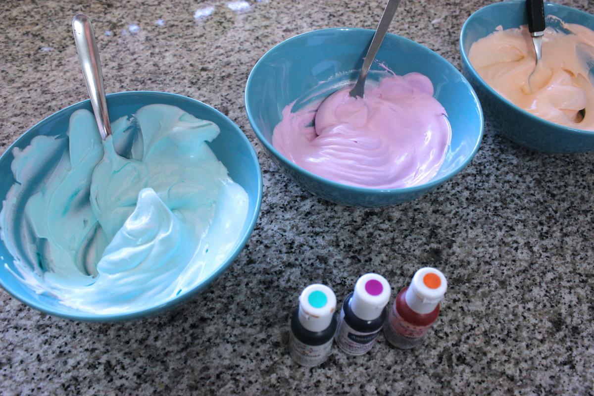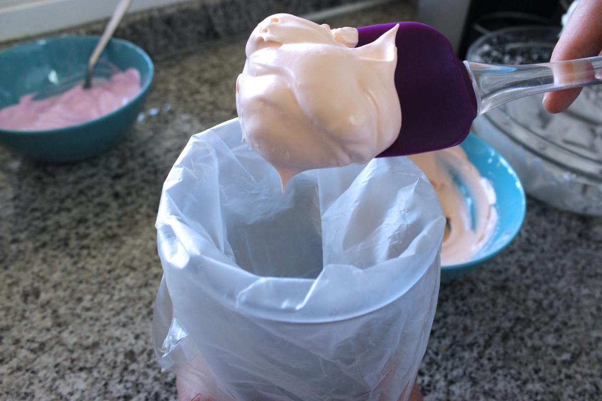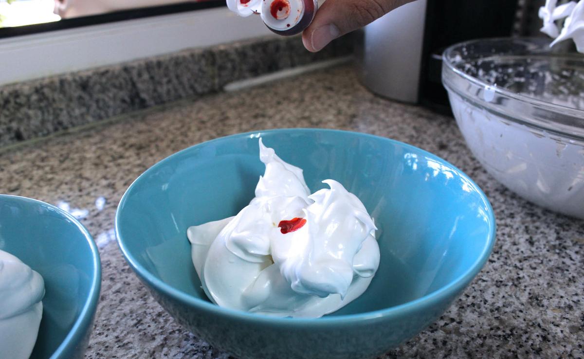 Lo siguiente será dividir la mezcla para pintarlo con los colorantes que queramos. Nosotros utilizamos colorantes en gel y lo recomendamos porque de este modo no se le añade humedad a nuestro merengue.