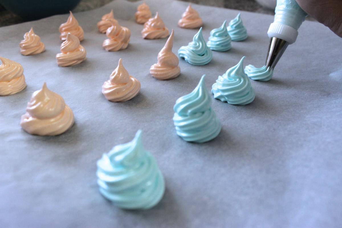 Antes de que nos digas que los merenguitos no son los mismos que los de la foto final tenemos que confesar algo, después de ponerlos sobre la bandeja nos dimos cuenta de que teníamos que usar una boquilla redonda para obtener el resultado que queríamos pero olvidamos tomar las respectivas fotos, así que hemos puesto esta sólo como ejemplo.