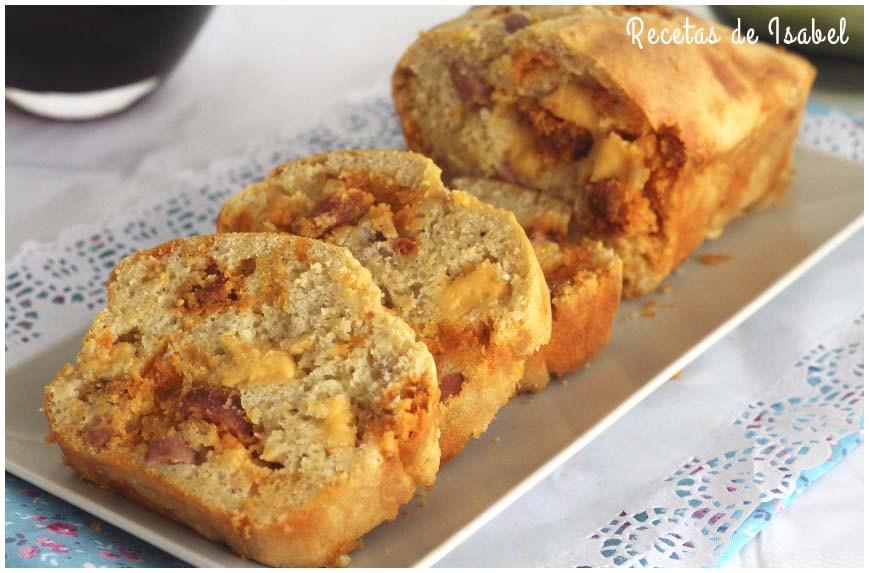 Plum cake salado relleno de chorizo, salchichas y cheddar