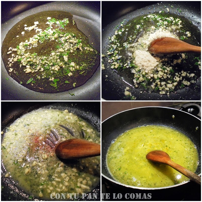 3. En una cazuela ancha sofreímos los dientes de ajo picados con el perejil y cuando esté dorado añadimos la harina y damos unas vueltas para que se tueste un poco.