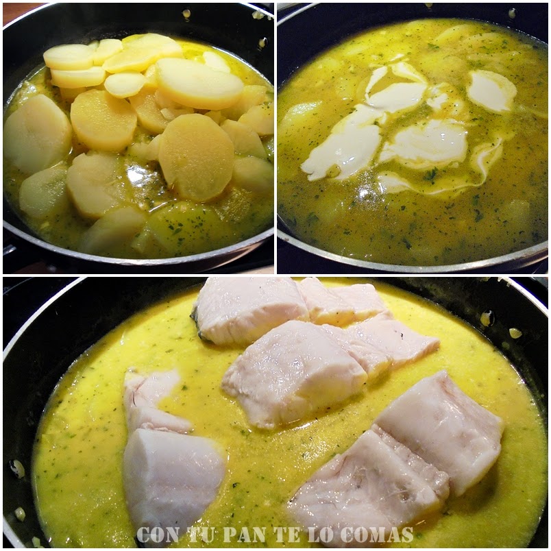 5. Incorporamos las patatas hervidas a la cazuela y dejamos que hiervan en el caldo unos minutos. Si ves que han quedado poco caldosas le añades un poquito más del caldo del pescado.