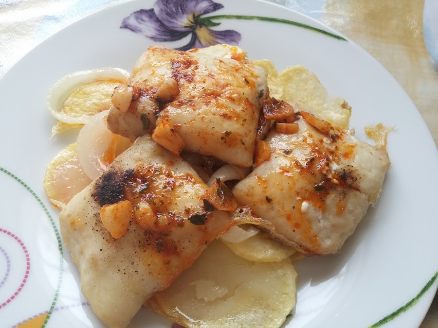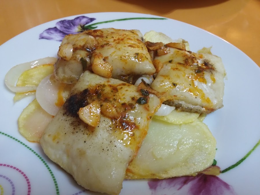 Por último vamos a repartir las patatas y las cebollas en cuatro platos y disponemos el pescado encima. Regamos con el sofrito de ajo y servimos.