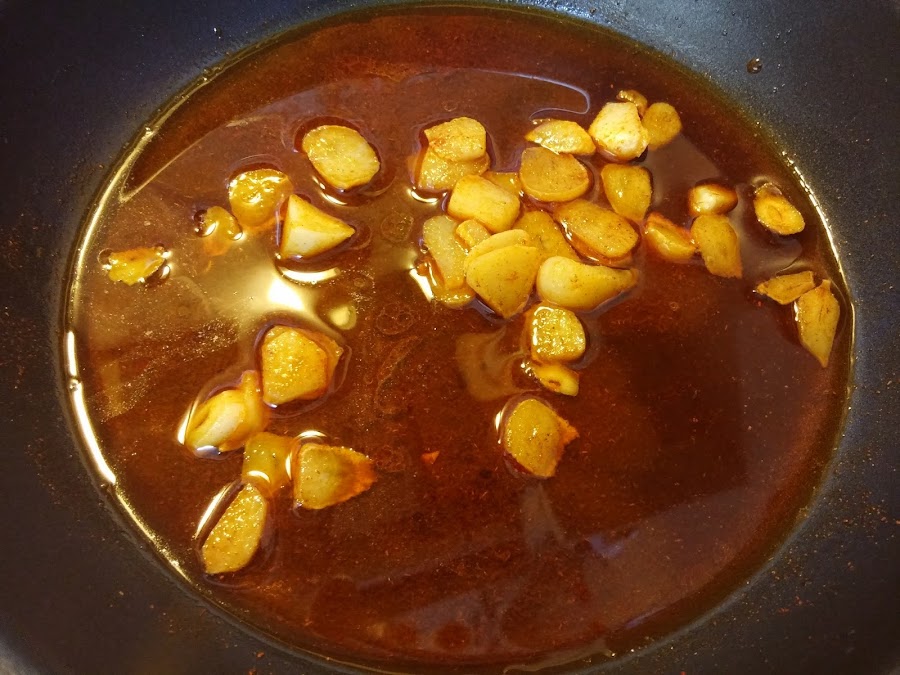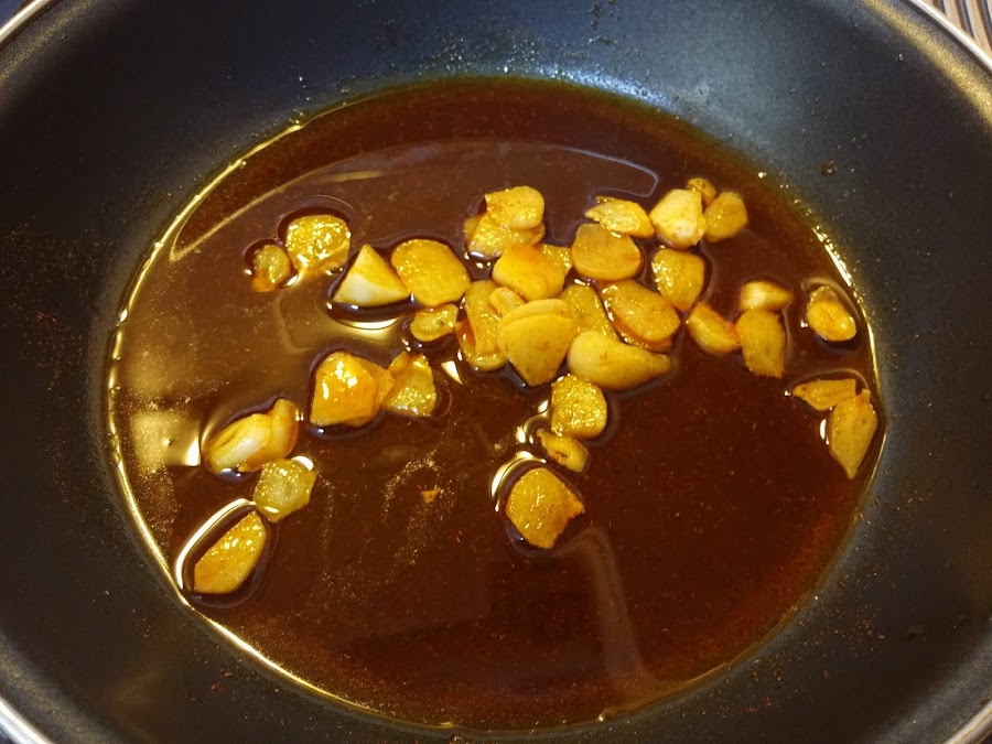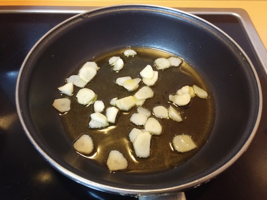 Pelamos los ajos y los cortamos a rodajas. Los freímos en una sartén con un fondo de aceite. Si ponéis la guindilla la ponéis a freír en este paso.