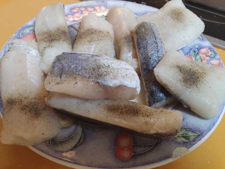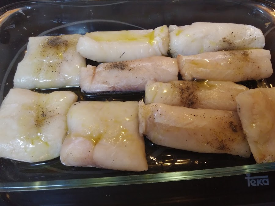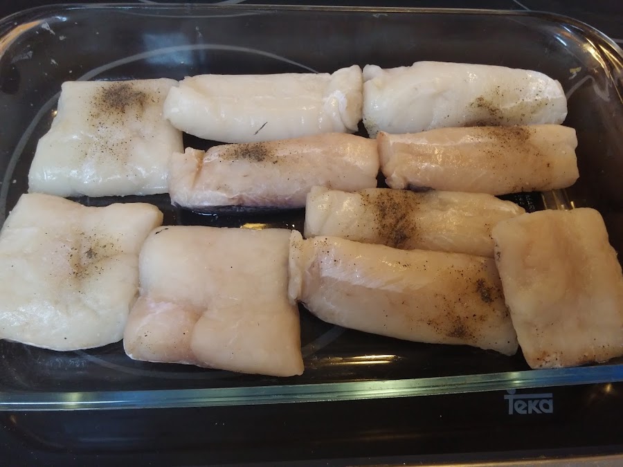 Ponemos a precalentar el horno a 200 grados. Sazonamos el pescado.