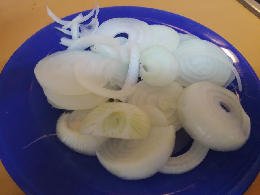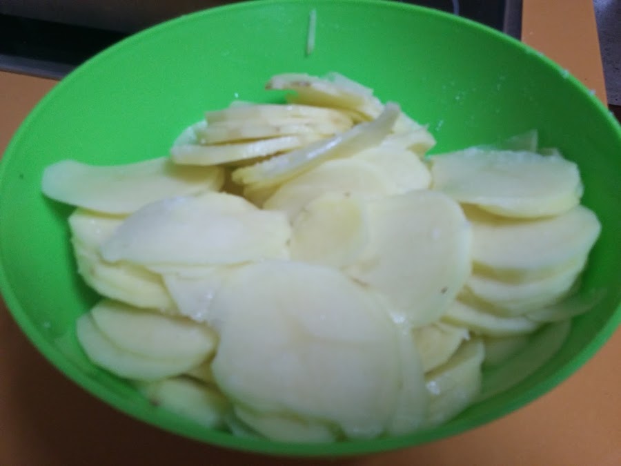 Ahora pelaremos las cebollas y las patatas y las cortamos en rodajas finas.