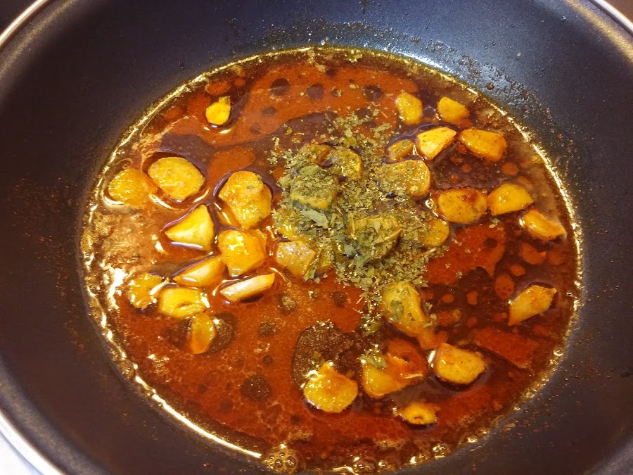 Apartamos los ajos del fuego y echamos una cucharadita de pimentón. Removemos.
