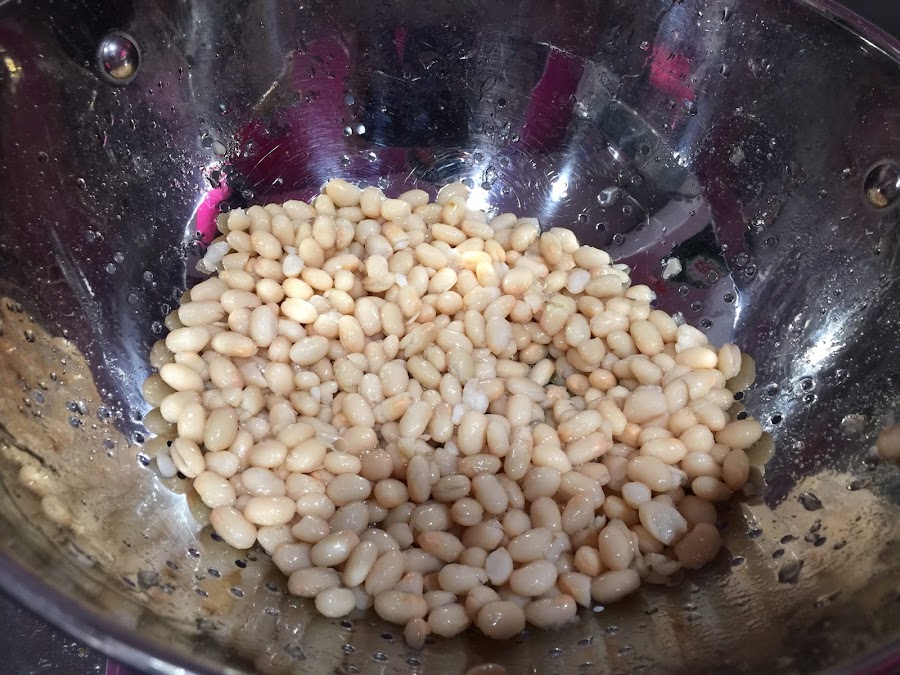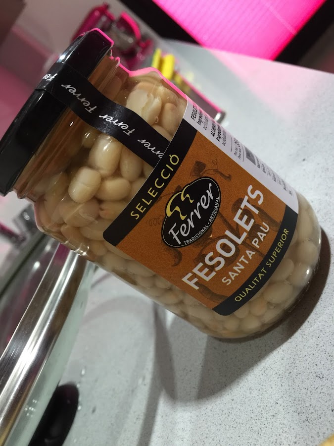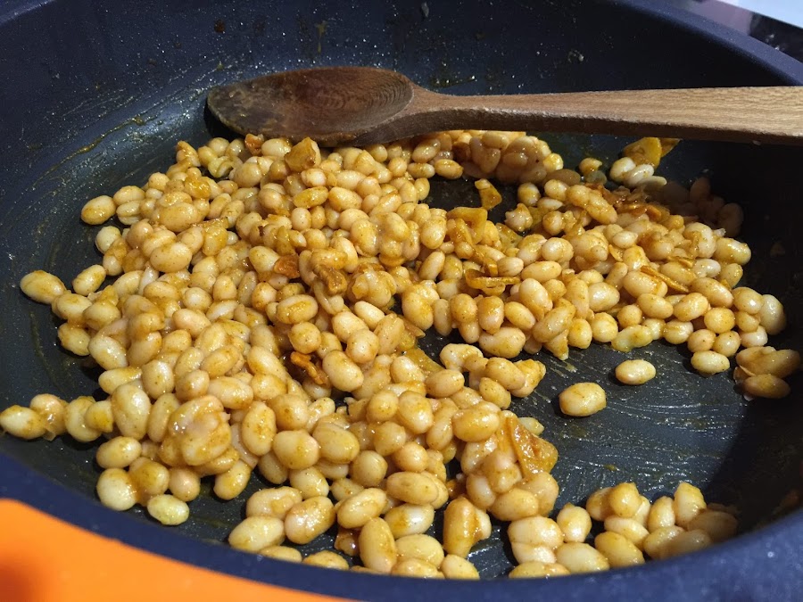 5. Escurrimos y lavamos las judías blancas. Las rehogamos en el sofrito de ajo y pimentón.