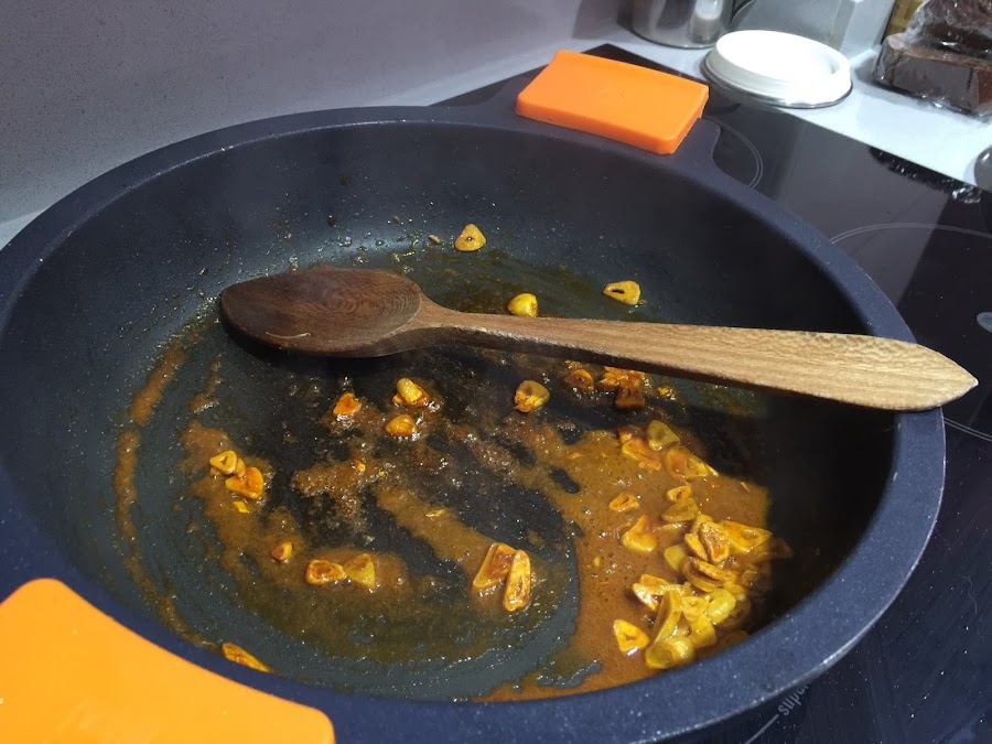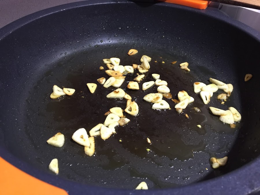 2. Pelamos y laminamos los 5 dientes de ajo. En la misma cazuela donde hemos marcado el pescado añadimos otro chorrito de aceite de oliva virgen extra. Incorporamos los ajos y a fuego bajo los doramos.