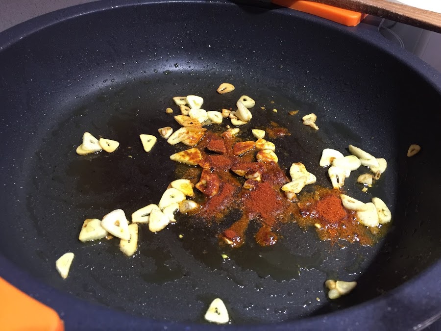 3. Cuando tomen un color tostadito añadimos las dos cucharaditas de pimentón, una dulce y otra picante. A fuego muy muy bajo rehogamos durante 1 minuto.