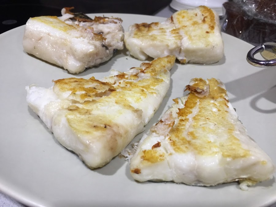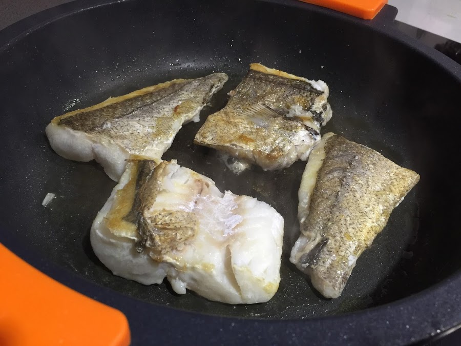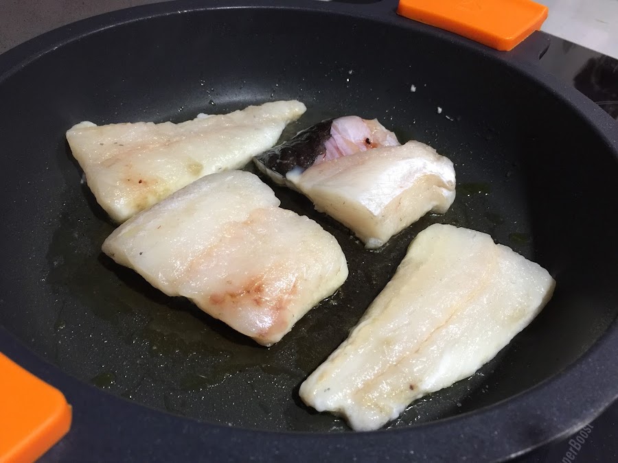 1. Empezamos lavando el pescado, a continuación lo salamos. Normalmente esta receta lleva el pescado enharinado y frito, pero para hacerla algo más ligera hemos hecho el pescado a la plancha. Calentamos la cazuela con un chorrito de aceite de oliva virgen extra, cuando este caliente ponemos los lomos de merluza por la parte de la piel hacia la cazuela. A fuego medio alto dejamos 5 minutos, damos la vuelta a los lomos y volvemos a dejarla 5 minutos mas. Reservamos la merluza en un plato para más adelante.