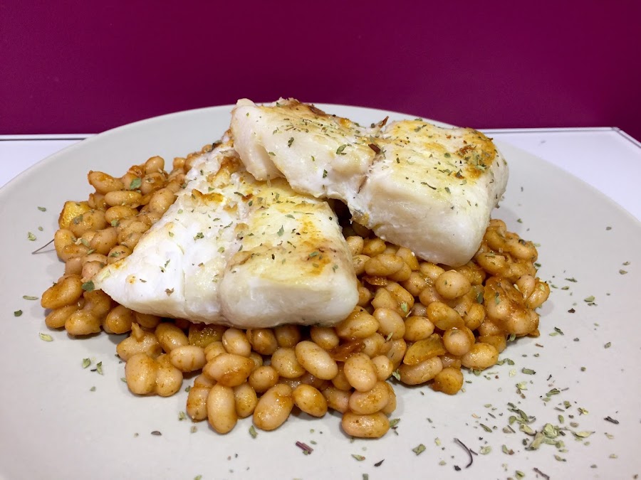 6. Emplatamos las judías en la base del plato y la merluza encima de ellas.